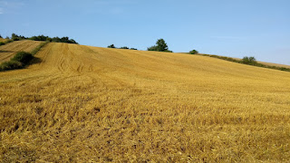 Chrzęszczący marsz rzepakowym ścierniskiem. Mimo wyczuwalnego oporu giętych butami grubych łodyg idzie się nieźle, chociaż oczywiście ciężej, ale pod warunkiem założenia masywniejszych butów i dobrze opiętych ochraniaczy. Kiedyś uczono mnie, jak chodzić na bosaka po ściernisku: otóż nie tyle podnosi się stopy, co przesuwa je tuż nad ziemią aby na bok przygnieść ucięte łodygi; nie można naciskać na nie z góry bo poranią stopę. Podobną technikę i tutaj trzeba stosować mimo butów. Raz jeden stanąłem na nisko uciętą grubą łodygę; okazała się na tyle sztywna, że utrzymała ciężar; w rezultacie but wygiął mi się na bok i zsunął; ledwie ustałem.